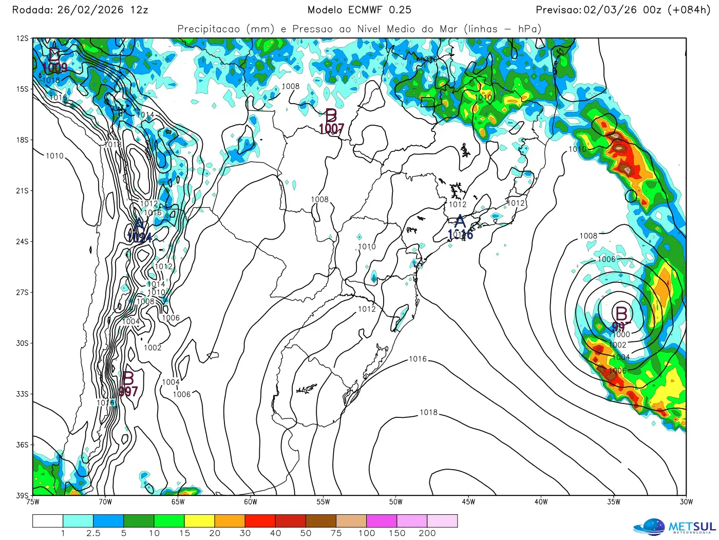 Não se descartam volumes extremos isolados, especialmente entre esta quinta e a sexta-feira, período apontado como o mais crítico. Múltiplas áreas de baixa pressão devem se formar sobre o mar no Atlântico e ao menos uma delas pode se converter em um ciclone, que pode vir a ser subtropical, durante este período de virada do mês.